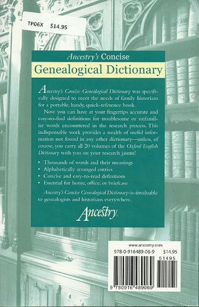 Is your research time wasted looking up words like "beamster," "grimgribber," "anascara," and "wainbote" in regular dictionaries? Ever heard of a "gossip's wheel" or a "shank's mare"? These and other unusual terms are defined in Ancestry's Concise Genealogical Dictionary. You will find this book a useful and entertaining reference. The authors spent years collecting, researching, and verifying definitions of terms they discovered while researching cemetery, probate, court, medical, and other records. The mystery of terms and abbreviations that many researchers face has been solved with this essential, quick-reference source geared to the needs of the genealogist. Now you can have at your fingertips accurate and easy-to-find definitions for troublesome or unfamiliar words encountered in the research process. With thousands of concise definitions, all arranged alphabetically, this dictionary is an essential for any genealogist's home, office, or briefcase.