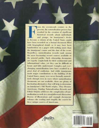 America is a nation of immigrants. Through naturalization records, genealogists, historians, and other scholars trace the immigration stores of individuals and groups that traveled from afar to call themselves Americans. They Became Americans provides an accurate, readable, and interesting historical framework for the citizenship process. It suggests ways of finding naturalization records and discusses the weaknesses and strengths of the different types of records. If naturalization records are not to be found, They Became Americans points to a variety of alternative sources for finding immigrant origins.