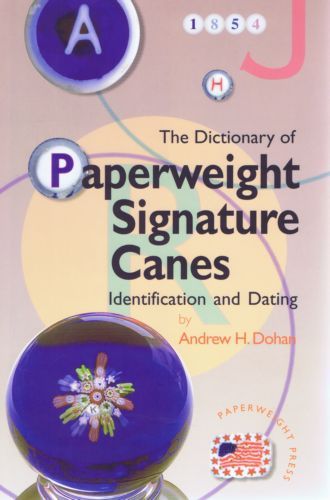 Dictionary of Paperweight Signature Canes--Identification and Dating by Andrew H. Dohan Includes separate price guide. Too many internet auction sellers don't know what they are selling. Become a paperweight expert! Ever wondered who really made that mysterious paperweight you inherited from your great aunt or picked up in the dusty corner of a second-hand store? You just might find the answer in "The Dictionary of Paperweight Signature Canes," by Andrew Dohan, Paperweight Press, 1997. This valuable reference has over 400 color close-up illustrations of the signature and date canes used by 110 antique and modern paperweight artists, bead makers and glass factories, plus those canes which might be confused as signature canes or which are fakes. The paperback book has 301 pages, all color illustrations, short biographical and anecdotal sections on each artist and factory with an abundance of interesting information, a comprehensive questionnaire for judging the value of unsigned pieces, a section describing the techniques used to create collectible glass paperweights as well as the signature canes themselves, an extensive bibliography of paperweight books and magazine articles, and an extensive index listing all initial and date canes. Don't pass up that valuable find because you don't know how rare it is! About the Price Guide: VALUE GUIDE Price guides, although helpful, are dangerous, as they represent monetary worth at a single point in time. Market conditions, of course, fluctuate. Most antique paperweights have seen a steady rise in value over the years. Many of the early artists from the 1960s and 1970s have declined in popularity as current-day artists produce more spectacular pieces.