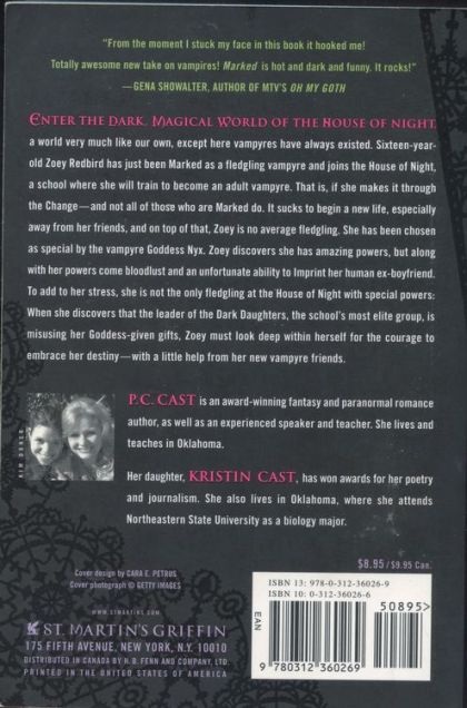 Enter the dark, magical world of the House of Night series by bestselling authors P.C. Cast and Kristin Cast, a world very much like our own, except here vampyres have always existed. One minute, sixteen-year-old Zoey Redbird is a normal teenager dealing with everyday high school stress: her cute boyfriend Heath, the school's star quarterback who suddenly seems more interested in partying than playing ball; her nosy frenemy Kayla, who's way too concerned with how things are going with Heath; her uber-tough geometry test tomorrow. The next, she's Marked as a fledgling vampyre, forcing her to leave her ordinary life behind and join the House of Night, a boarding school where she will train to become an adult vampyre. That is, if she makes it through the Change—and not all of those who are Marked do. It sucks to begin a new life, especially away from her friends, and on top of that, Zoey is no average fledgling. She has been chosen as special by the vampyre Goddess, Nyx. Zoey discovers she has amazing powers, but along with her powers come bloodlust and an unfortunate ability to Imprint with Heath, who just doesn't know how to take "no" for an answer. To add to her stress, she is not the only fledgling at the House of Night with special powers: when she discovers that the leader of the Dark Daughters, the school's most elite group, is misusing her Goddess-given gifts, Zoey must look deep within herself for the courage to embrace her destiny—with a little help from her new vampyre friends.