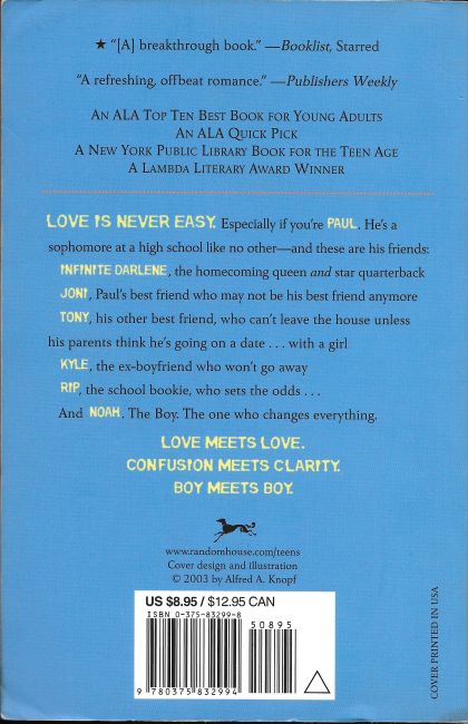 This is the story of Paul, a sophomore at a high school like no other: The cheerleaders ride Harleys, the homecoming queen used to be a guy named Daryl (she now prefers Infinite Darlene and is also the star quarterback), and the gay-straight alliance was formed to help the straight kids learn how to dance. When Paul meets Noah, he thinks he’s found the one his heart is made for. Until he blows it. The school bookie says the odds are 12-to-1 against him getting Noah back, but Paul’s not giving up without playing his love really loud. His best friend Joni might be drifting away, his other best friend Tony might be dealing with ultra-religious parents, and his ex-boyfriend Kyle might not be going away anytime soon, but sometimes everything needs to fall apart before it can really fit together right.This is a happy-meaningful romantic comedy about finding love, losing love, and doing what it takes to get love back in a crazy-wonderful world.