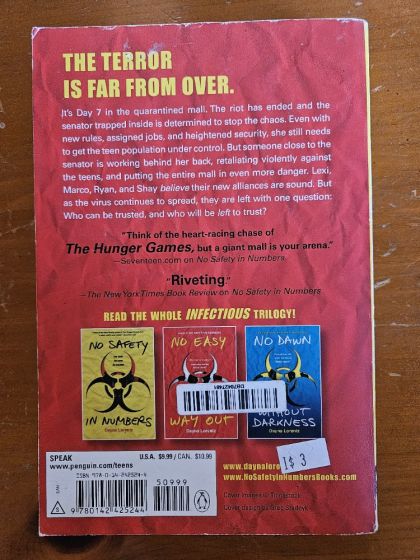 The sequel to No Safety in Numbers; a modern day Lord of the Flies for fans of apocalyptic thrillersIt's Day 7 in the quarantined mall. The riot is over and the senator trapped inside is determined to end the chaos. Even with new rules, assigned jobs, and heightened security, she still needs to get the teen population under control. So she enlists Marco's help--allowing him to keep his stolen universal card key in exchange for spying on the very football players who are protecting him.But someone is working against the new systems, targeting the teens, and putting the entire mall in even more danger. Lexi, Marco, Ryan, and Shay believe their new alliances are sound.They are wrong. Who can be trusted? And who will be left to trust?The virus was just the beginning.