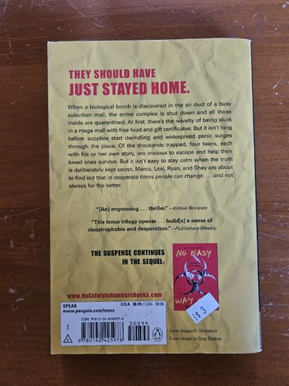 "Think of the heart-racing chase of The Hunger Games, but a giant mall is your arena."--Seventeen.comA suspenseful survival story and modern day Lord of the Flies set in a mall that looks just like yours. A biological bomb has just been discovered in the air ducts of a busy suburban mall. At first nobody knows if it's even life threatening, but then the entire complex is quarantined, people start getting sick, supplies start running low, and there's no way out. Among the hundreds of trapped shoppers are four teens. These four different narrators, each with their own stories, must cope in unique, surprising manners, changing in ways they wouldn't have predicted, trying to find solace, safety, and escape at a time when the adults are behaving badly. This is a gripping look at people and how they can—and must—change under the most dire of circumstances. And not always for the better.