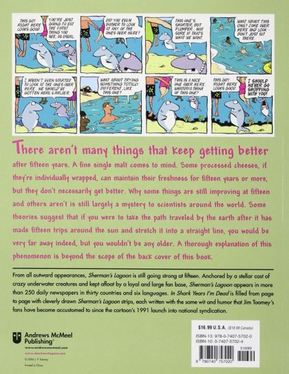 After ten book collections and a treasury, great white shark Sherman and the Lagoonies celebrate 15 years of life under the sea with this new collection of creator Jim Toomey's daily cartoons and full-color Sundays. In an imaginary lagoon near the island of Kapupu in the South Pacific lives a group of nutty but sophisticated underwater creatures-complete with neuroses that rival those of humans (also known as "hairless beach apes"). Their wet world, oddly enough, is not so different from our own. Sherman, a great white shark, is a typical guy, and Megan is his ruthless but nurturing wife. Rounding out the aquatic crew are Fillmore the turtle, geeky fish Ernest, and macho hermit crab Hawthorne. Salty old Captain Quigley, who lost his leg to Sherman years ago, is hell-bent on seeking revenge against the shark. Sherman and friends effectively reflect human behavior and occasionally must confront humans' encroachment on their unspoiled habitat. Activist groups have applauded this comic strip with a social conscience for promoting marine conservation. Sherman's Lagoon has been syndicated since 1991, currently by King Features, and has a circulation of more than 200 daily newspapers on five continents.