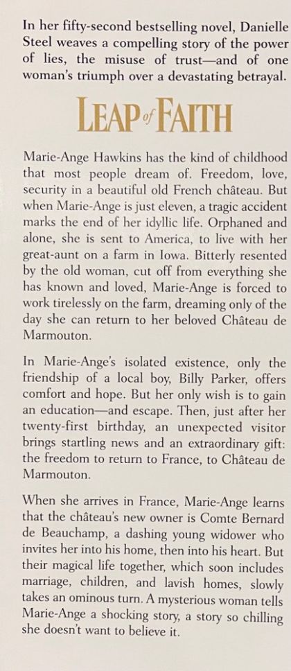 In her fifty-second bestselling novel, Danielle Steel weaves a compelling story of the power of lies, the misuse of trust — and of one woman's triumph over a devastating betrayal.Marie-Ange Hawkins has the kind of childhood that most people dream of. Freedom, love, security in a beautiful old French château. But when Marie-Ange is just eleven, a tragic accident marks the end of her idyllic life. Orphaned and alone, she is sent to America, to live with her great-aunt on a farm in Iowa. Bitterly resented by the old woman, cut off from everything she has known and loved, Marie-Ange is forced to work tirelessly on the farm, dreaming only of the day she can return to her beloved Château de Marmouton.In Marie-Ange's isolated existence, only the friendship of a local boy, Billy Parker, offers comfort and hope. But her only wish is to gain an education — and escape. Then, just after her twenty-first birthday, an unexpected visitor brings startling news and an extraordinary gift: the freedom to return to France, to Château de Marmouton.When she arrives in France, Marie-Ange learns that the château's new owner is Comte Bernard de Beauchamp, a dashing young widower who invites her into his home, then into his heart. But their magical life together, which soon includes marriage, children, and lavish homes, slowly takes an ominous turn. A mysterious woman tells Marie-Ange a shocking story, a story so chilling she doesn't want to believe it.Not even her dear friend Billy can help her now. He is thousands of miles away. And as the darkness gathers around her, Marie-Ange must find the faith and courage to take one, last desperate step to save her loved ones ... and herself.Danielle Steel's powerful new novel is about being pulled into a place where nothing is what it seems. It is about being seduced and lied to and turned around, and wanting to believe the lies — until the moment comes, in one blinding instant, when survival and salvation depend on a final Leap of Faith: the only path to freedom, and life.