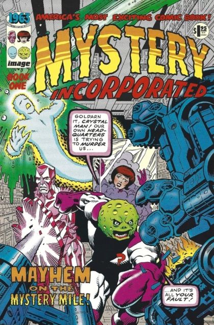 Things start going wrong with the automatic defenses of the underground fortress of Mystery Incorporated when the Neon Queen sees a strange man reverse waling in the Maybe Machine room; Fantastic Four homage. Spoof of the old Marvel Bullpen Bulletins pages. A fake letter page with letters for an issue that was never published. Pin-ups of Crystal Man, Planet and Kid Dynamo from Mystery Incorporated. Pin-up of Neon Queen from Mystery Incorporate by Melinda Gebbie. Phony ad for courses in speaking better English by Veitch.