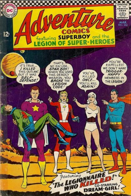 Star Boy is put on trial for killing Kenz Nuhor of Naltor. Superboy defends him, arguing that the non-invulnerable Legionnaires should be allowed to kill in self-defense. Star Boy is expelled. He and Dream Girl join the Substitute Heroes. First appearance of Legion rejects Calamity King (E. Davis Ester of Touston) and Color Kid (Ulu Vakk of Lupra).