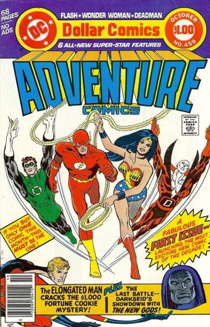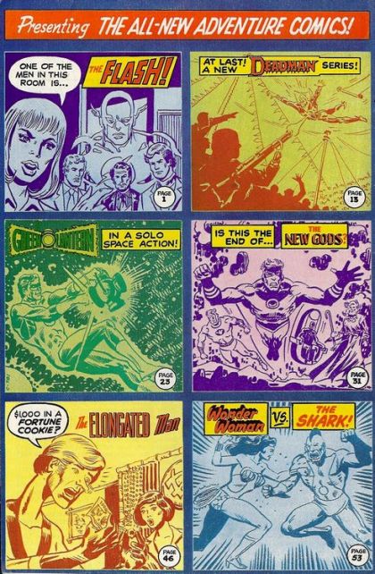 The Flash: "The Crimson Comets of Fallville High": A man at Barry Allen's class reunion learns from a psychic classmate that one of the attendees is really the Flash, and he intends to put the knowledge to his best use. Deadman: "Murder Haunts the Midway": Deadman returns for an unseen visit to Hills Circus. He unites with his brother's body for a trapeze performance, and during his possession a gunman, from the crowd, shoots Cleveland Brand in the back. Tiny manages to save the wounded aerialist by catching him. When Deadman tries to inhabit the gunman's body, he is unable to control him or to prevent him from committing suicide. Inga, Cleveland's Russian bride, feels that the Communists are behind the murder attempt, but Cleve and the circus people promise her that they will stand together against the threat. Green Lantern: "The Call of the Cosmos": While on the road, Hal Jordan must become Green Lantern to save a woman who has come half a galaxy to meet him from parasitic energy-drainers. New Gods: "Climax of Chaos": Orion frees the six humans, forces Desaad to tell what else he knows of Darkseid's plans, while the other New Gods fight the Antagonist on Earth. Orion then goes to face Darkseid, and is offered alliance with his father, but refuses. Darkseid blasts him, and then flies away. Elongated Man: "The Case of the Fortune Cookie Fortune": While visiting a small town, Elongated Man and his wife are invited to eat at a local Chinese Restaurant. While dinning, they discover that the fortune cookies have $1,000 bills tucked inside them, and Ralph's nose goes a-twitching as he wonders who is paying for this publicity stunt. Wonder Woman: "The Shark's Dark Demand": On her way to Paradise Island in the Robot Plane, Wonder Woman encounters the Shark, who has reevolved from his shark-state and now wishes to defeat her and make her his mate. Wonder Woman manages to defeat him and compels him with her magic lasso to return to his shark-state and never again seek to evolve past it.