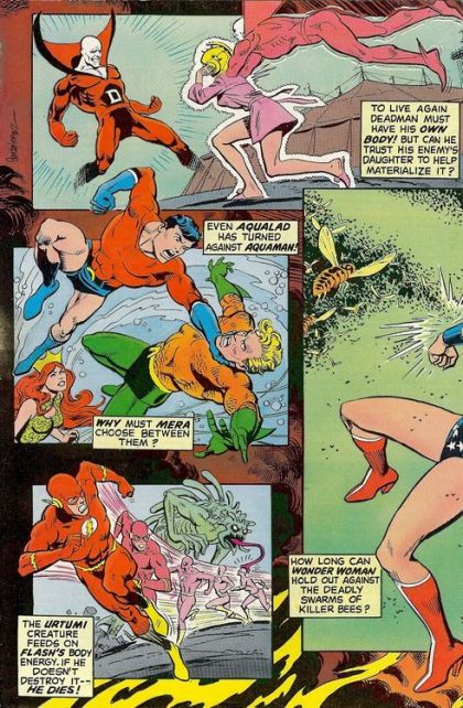 Flash: "Urtumi the Image Eater": An Indian legend leads the Flash to an ectoplasm-eating monster who menaces Central City. Deadman: "Mind Over Murder": Vashnu succeeds in persuading Kronsky to remove the helmet and abandon his dreams of power. But now the helmet becomes sort of a hot potato as it exchanges several hands in the next several minutes. First, Deadman occupies Inga Brand's body, dons the helmet, and uses it to fashion him a new, solid body. However, the body disintegrates after a few seconds. Then, another man appears and steals the helmet, but Deadman occupies his brother's body, which causes the man to be thrown into a tank full of water, and die when the helmet explodes. With the helmet destroyed, Kronsky (who invented the helmet) feels that he has nothing left now, but Inga reassures him that he has a place with his new family, the circus people. Deadman, angered, asks Rama Kushna why was he taunted with freedom from his ghostly state. Rama appears as a face on a tree, and tells Deadman that he must adjust to his ghostly gift, and warns him that it may last for an eternity. Deadman screams in frustration. Justice Society of America: "The Night of the Soul Thief": The Justice Society comes to grips with the sorcerer who gave Bill Jensen the power to kill Batman. Aquaman: "Climax": Aquaman has to fight Vulko's guards, Mera, and Aqualad to close in on with Amos and Universal Food Products. But when Aqualad, in hiding, hears Amos boast about how he intends to “accidentally” obliterate Atlantis and the evidence of his wrongdoing, he comes to realize that his mentor was right. Aquaman manages to destroy the U.F.P. operation and save Aqualad from an explosion. Later, Vulko, Mera, and Aquaman are reconciled, and Vulko reveals that Amos has been “persuaded” to sever business ties with Atlantis. Wonder Woman: "The Insanity Swarm": A swarm of killer bees attack the spaceflight center where Diana Prince is in astronaut training, and leave instructor Conrad Starfield and thirteen others in comas. Diana becomes Wonder Woman, battles the swarm, and learns that the Queen Bee is behind the insects. The heroine tracks the Queen Bee to her hive and defeats her, but learns that the villainess has captured her victims' minds and placed them in her computer, which is set to self-destruct if any hand tampers with it. However, the Queen Bee offers Wonder Woman a chance to save them, if she first becomes the Queen's slave.