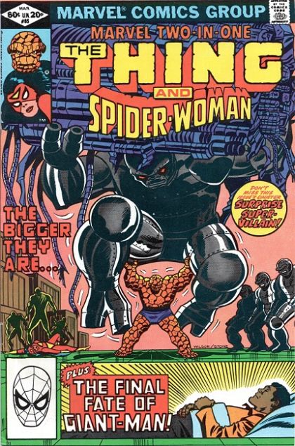 With his body in the final stages of terminal cancer, Giant-Man tries to sleep in the medical lab of the Baxter Building. He is plagued by nightmares of battling a dark-garbed figure. His mind eventually drifts back to his past when he was working at Stark-West in California with his friends the Whiz Kids and the events that led to him using Henry Pym's Pym Particles to become Black Goliath. He recalls one of his early battles where he fought the villain known as Atom Smasher who was responsible for administering the dose of radiation that eventually gave Bill cancer. Tragically, Atom Smasher died during that confrontation, taking all the secrets of his power with him. Murdered by the villain known as Stilt-Man, Black Goliath tried to capture Atom Smasher's assassin but had no strength to do it, the first sign that he had contracted cancer. Despite this, the Black Goliath continues his super-hero career and his relationship with Celia Jackson. It wasn't until he discovered the truth, that he had cancer, that Foster packed things up and moved to Project P.E.G.A.S.U.S. in New York in the hopes of finding a way to cure himself. There he reinvented himself as Giant-Man and made friends such as the Thing, Quasar, Thundra and the Aquarian. Bill wakes up from his dreams feeling more exhausted than ever and still down on himself for his lackluster super-hero career. He is greeted by Mister Fantastic and the Thing who tell him to take it easy. When Reed tells Bill that he would like to conduct more tests, Foster declines as he has decided to accept his fate and would like to put his final affairs in order. Reed protests this, but Bill is insistent on enjoying his final days instead of squandering them. Ben agrees with Bill, and Reed eventually relents, reluctantly. As Bill and Ben head to the Pogo Plane and take off for California, Reed blames himself for not being able to find a cure, but was certain that he could have found one if given more time. Meanwhile, in San Francisco, Spider-Woman is on a case for an insurance company to investigate a series of robberies of electronics companies. Staking out the next most likely location to get hit, Spider-Woman hits the jackpot when she catches some costumed men trying to break in. She swoops in for the attack, but is blasted the thieves mysterious and super-powered villain. The energy blast makes Spider-Woman's body feel like it's on fire and she eventually passes out. Convinced that their foe is dead, the leader of this group orders his men to load up and take off. As the ship takes off, Spider-Woman recovers from the blast, as the spider venom in her system fights off and makes her immune to the lethal dose of radiation her body was dealt. Having lost the trail, Spider-Woman decides to return to her apartment so she can shower and call it a night. Recalling how one of the men mentioned Los Angeles, Jessica Drew decides to investigate that possible lead. The following afternoon the Thing and Bill Foster pay a visit to Stark-West in LA where Bill is reunited with the Whiz Kids. He is also happily reunited with Celia Jackson and the two share a kiss. Deciding that this a moment for privacy, the Thing decides to go on a tour of the Stark-West Facilities. While outside he comes across a security guard who has been knocked out when suddenly he is ambushed by the same men who robbed the facility in San Francisco the night before. The Thing makes short work of them and is then confronted by their leader, a man calling himself Atom Smasher. When Ben asks if he is the same man who poisoned Giant-Man, Atom Smasher denies it, stating that he is still alive before blasting the Thing. While outside of the facility, Jessica Drew arrives by cab and hears the battle raging within the facility. Getting to some cover, Jessica then changes into Spider-Woman. However, she arrives on the scene too late, as does Bill Foster and the Whiz Kids, as this new Atom Smasher and his minions escape with what they came for. However, even though their foe has escaped, Bill gets to work developing a device that will allow them to track the unique radiation that emanates from his body, while the Whiz Kids discover what the villain is trying to build: a bomb. Meanwhile at Atom Smasher's hideout within an abandoned electrical company he and his minions have finished constructing his device: The Neutralode, a device that will flood the city with radiation, killing millions. Just then, the Thing, Spider-Woman and Bill Foster come crashing in through the walls. With Atom Smasher's minions dropping like flies, a group of them are ordered to hop into giant robots to fight off the heroes. While the Thing makes short work of these robots, Spider-Woman is felled by another radiation blast from Atom Smasher, but this time she is only playing possum as her body has become completely immune to his radiation. When she tries to go after him, the Thing tries to stop her when she tells him that she is immune to his radiation. This shocking revelation causes Ben to hope that there just might be a cure for Bill after all. At that moment Bill tries to risk using his size-changing powers one last time to destroy the Neutralode but is attacked by Atom Smasher. Even though his foe fights Bill off and makes it to his weapon, it had been seriously damaged in the battle. Not listening to Bill's warnings to stop, Atom Smasher activates the device and is seemingly killed when the device explodes. With Atom Smasher seemingly killed, Bill has completely lost all hope of finding a cure. Shrinking back down to his normal size he has grown too weak and passes out. The Thing and Spider-Woman then take him back to Stark West. After the Whiz Kids examine her, they determine that a blood transfusion from Spider-Woman can cure Bill of his cancer. However, it will come at a price: if Spider-Woman gives this blood transfusion it will strip her of her immunity factor. Despite this, Spider-Woman agrees to the transfusion as i