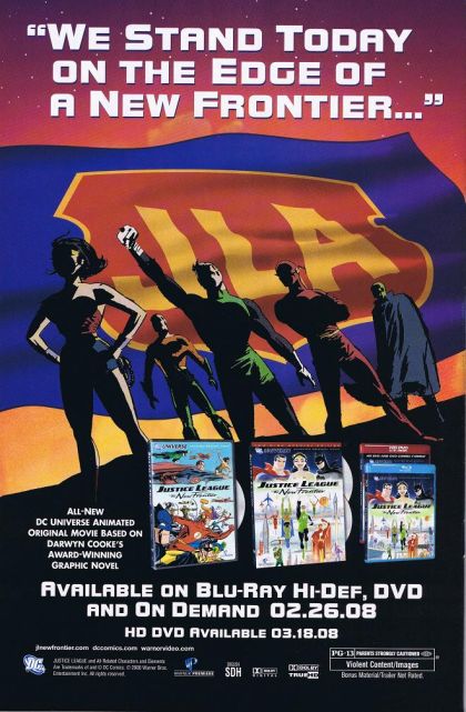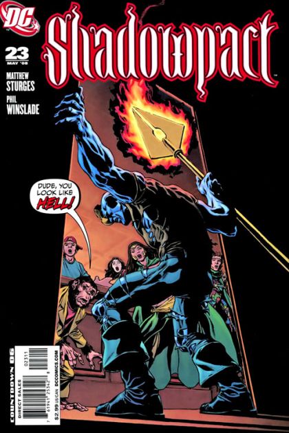Shadowpack chases an imp, finally snagging it, but it has managed to open a "threshing box" which begins tearing souls from bodies. Zauriel smashes it, and Detective Chimp notes its similarity to other objects. Meanwhile, Blue Devil has reached the sixth of his labors, the Spider of the Roman Catacombs. Due to a communication problem, he must defeat it with... a blender? But he does, as he recounts to Shadowpact later. Indeed, he has finished all his labors, and as promised the Church grants him an indulgence. But it cannot intervene in the infernal contract. For that, Blue Devil must rely on Ken Green. In Gotham's Breed Building, Jack of Fire has become Doctor Gotham's new associate, and has brought him souls in a threshing box. The Sun King has nearly all it needs. In Hell, Ken reveals a clause that permits Jack of Fire to free his brother. Blue Devil outranks his brother, and orders him to free the family, which he must do. His estates and titles revert to Jack of Fire, and he loses his trident and powers. That's when the Phantom Stranger appears, and explains how the Sun King is very nearly manifest, and how this is Shadowpact's fight. And, he brings in the Shadowpact teams of 1908 and 2108 to help...