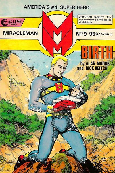 1st Feature: Scenes from the Nativity Miracleman rescues Liz who is now heavily pregnant. They don't make it back home in time & Liz gives birth in the middle of nowhere. Miraclebaby starts to talk the minute she's born. In the meantime, Johnny Bates continues to struggle with his psycho alter-ego as 2 seemingly odd humans (later issues reveal them to be of the alien Qys race) visit him at St. Crispin's Hospital for the Mentally Ill. 2nd Feature: Laser Eraser & Pushbutton - Corsairs of Illumium