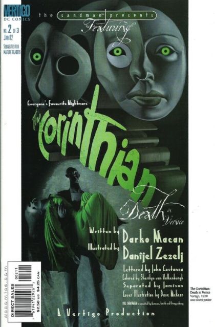 WRITTEN BY DARKO MACAN; ART BY DANIJEL ZEZELJ; PAINTED COVER BY DAVE MCKEAN In stores November 28. VERTIGO's newest miniseries continues. Venice, 1920. The dark mirror known as The Corinthian is desperate to find someone to teach him how to kill. His intended prey, former wartime adversary Charles Constantine has proven to be too much of a coward. So the Corinthian sets his sights on Charles's eclectically morbid accomplice, Coco. The social dynamics of Europe's upper class and the working class are exposed as police brutality and a nasty parade of bullets give the Corinthian the upper hand in this twisted tale of horror. MATURE READERS FC, 32 PG. (2 OF 3) $2.50 Cover price $2.50.