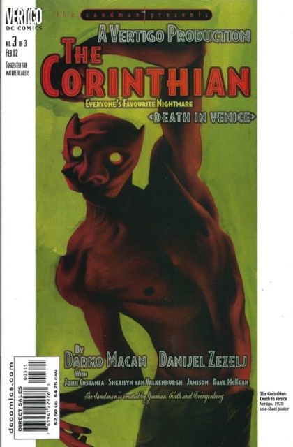 WRITTEN BY DARKO MACAN; ART BY DANIJEL ZEZELJ; PAINTED COVER BY DAVE MCKEAN In stores December 26. Post-war horror and decadence collide as the Venice Carnivale opens to a raging crowd...and closes with a trail of dead bodies. The identity of the killer can only be linked to exactly who ? and what ? the Corinthian has become, as the Sandman's Dark Mirror passes the final test of his manhood, leaving empty souls (and eye sockets) in his wake. MATURE READERS FC, 32 PG. (3 OF 3) $2.50 Cover price $2.50.