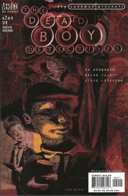 THE SANDMAN PRESENTS: DEAD BOY DETECTIVES #2 WRITTEN BY ED BRUBAKER; ART BY BRYAN TALBOT AND STEVE LEIALOHA; COVER BY DAVE MCKEAN In stores July 18. The mystery heats up as the mysterious Marquez de Marquis reveals to our young, and very dead, detectives Charles & Edwin that they are on the trail of an immortal killer who must drain his victims lives to stay alive. The boys get a bone-chilling history lesson and learn more about their own ghostly abilities as they close in on their prey. MATURE READERS FC, 32 PG. (2 OF 4) Cover price $2.50.