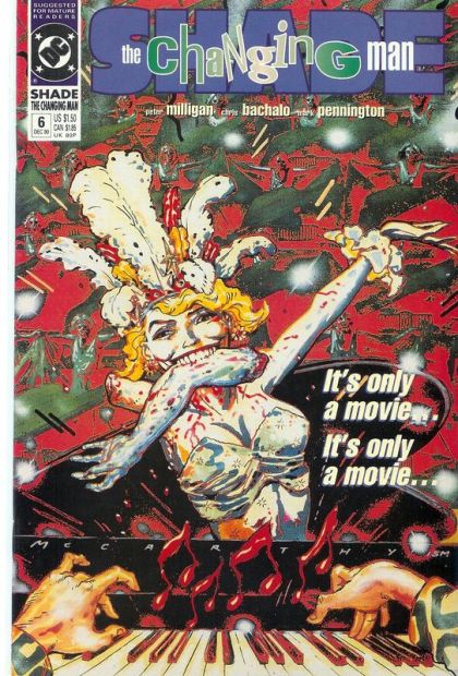 If life is a movie, why doesn't it make more sense? Shade and Kathy must puzzle it out, or remain trapped forever in the Film of Life. Written by Peter Milligan, with art by Chris Bachalo and Mark Pennington. Painted cover by Brendan McCarthy. Suggested for Mature Readers. New Format. Cover price $1.50.