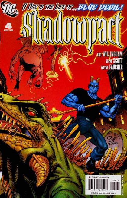 Many groups over history have taken the name of the Shadowpact, and almost all of them have been destined to only take up lost causes. This particular incarnation, however, was instrumental in stopping the Spectre's rampage against all things magical. The Phantom Stranger wonders if this particular group can avoid the fate usually reserved for the Shadowpact in the way that the Blue Devil defies his own nature to be a hero.The Blue Devil has settled into a neighborhood in Metropolis, where he's been embraced as the neighborhood hero. As he heads out meet the rest of the Shadowpact at the Oblivion Bar he gets sidetracked and attacked by the Demonic Retrieval Corps. But as he battles demons, dragons and muggers... can anybody just remember his name?