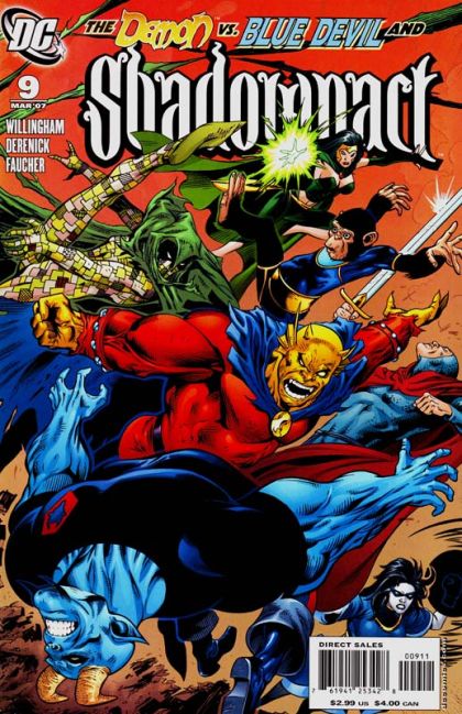 With the aid of Detective Chimp, the Shadowpact have identified their comrades among the Wild Huntsman's pack. After freeing them from the spell, aided by Rex the Wonder Dog, Nightshade, Ragman and Blue Devil plan to try to track the Huntsman down.Enchantress takes a trip to call in a favor from an old acquaintance, obtaining an object that should be of great help to the Shadowpact, while Nightmaster and Detective Chimp sit down and brainstorm about how to actually operate as a super-team.