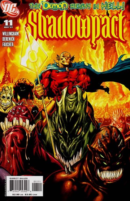 Following their initial disastrous encounter with the Demon Etrigan, the Shadowpact are splintered. Nightmaster and Detective Chimp are injured, Enchantress is forced to use her own life energy to maintain a spell keeping Nightmaster alive, and the spirits inhabiting Ragman's suit are more frightened of Etrigan than of remaining trapped for eternity. So Blue Devil, newly demoted to the rhyming caste of demons, has recruited others to help him in retrieving the Lucifer Trident, taken from him by Etrigan.
