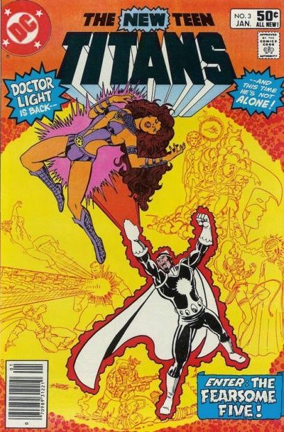 Dr. Light recruits his own super-team of villains, including Mammoth, Shimmer, Gizmo, and Psimon, to battle the New Teen Titans. Meanwhile, Starfire relates to her teammates the story of how she was sold into slavery as a child to end a war that had ravaged her home planet. Raven abruptly appears and sends the Titans into an inconclusive battle with the newly-formed Fearsome Five. She then discovers that one of the villains, Psimon, is secretly an agent of Trigon, the menace she had originally organized the Titans to battle. Later, as the Titans investigate the “Titans Tower” headquarters which has been built for them by parties unknown, Raven reveals a connection between Trigon’s planned takeover of Earth and the heroes of the Justice League of America. Before they can act on this information, all the Titans except Raven are defeated and captured in a second battle with the Fearsome Five.