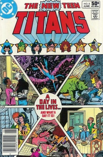Between cases, the Teen Titans experience several pertinent Incidents in their civilian identities. When Starfire meets Donna (Wonder Girl) Troy for lunch, she also meets Donna’s boyfriend, Terry Long, and gets a job as a fashion model at the agency for which Donna is a photographer. Raven uses her mystic “soulself” to defeat campus terrorists, and experiences almost unbearable horrors when her astral projection remains separated from her body for too long a period of time. Changeling is called upon to investigate mysterious deaths among the Board of Directors of Dayton Industries, of which he is in charge in the absence of his foster-father, Steve (Mento) Dayton. Cyborg attempts an unsuccessful reunion with his former girlfriend (from before his transformation), then unexpectedly becomes friends with Sarah Simms, a teacher, and her class of handicapped students. Kid Flash discusses his life as a reluctant super-hero with his parents.