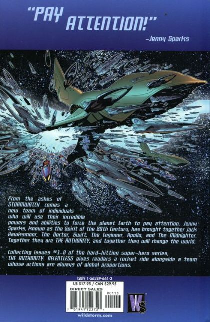 After witnessing the demise of most of her StormWatch teammates, Jenny Sparks wants to create a new super hero team dedicated to protecting Earth against threats of a global scale. Joined by former StormWatch members Jack Hawksmoor and Shen Li-Min, Jenny recruits four new members, the Doctor, the Engineer, Apollo, and the Midnighter forming the ultra-powerful Authority. Collected in this edition are their first two missions, battling a nation of super-powered terrorists and stopping an invasion from a parallel world.