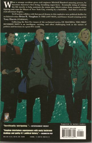 Written by Brian K. Vaughan Art by Tony Harris & Tom Feister Cover by Harris Award-winning writer Brian K. Vaughan (PRIDE OF BAGHDAD, Y: THE LAST MAN) uniquely combines big city politics and superheroes in this much-lauded series. Set in our modern-day world, EX MACHINA tells the story of civil engineer Mitchell Hundred, who becomes America's first living, breathing super-hero after a strange accident gives him the power to communicate with machines. Eventually Mitchell tires of risking his life merely to maintain the status quo, retires from masked crime fighting and runs for mayor of New York City, winning by a landslide. This deluxe edition collects the first 10 issues of EX MACHINA in hardcover for the first time, along with several special bonus features. Advance-solicited; on sale June 18 ? 272 pg, FC, $29.99 US ? MATURE READERS