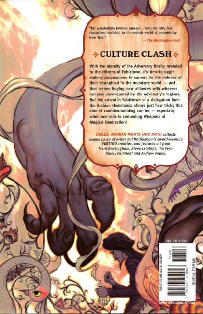 Written by Bill Willingham Art by Mark Buckingham, Steve Leialoha, Jim Fern, Jimmy Palmiotti and Andrew Pepoy Cover by James Jean Collecting issues #42-47 of writer Bill Willingham's Eisner Award-winning creation, FABLES: ARABIAN NIGHTS (AND DAYS) opens a new front in the struggle between the Fables and the Adversary as the worlds of the Arabian Fables are invaded - leading to an unprecedented diplomatic mission to Fabletown and a bad case of culture shock! This seventh volume of the popular Vertigo series also includes 'The Ballad of Rodney and June,' the 2-part story of forbidden love among the Adversary's wooden soldiers, and features stellar art by Mark Buckingham, Steve Leialoha, Jim Fern, Jimmy Palmiotti and Andrew Pepoy.