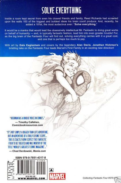 Written by JONATHAN HICKMAN Penciled by DALE EAGLESHAM Cover by ALAN DAVIS Be there as Marvel's newest exciting creator, Jonathan Hickman, teams up with superstar artist, Dale Eaglesham, to give you the Fantastic Four experience you've been waiting for! It's adventure, it's family, it's tough questions in dark times. Ben and Johnny prepare for a trip to Nu-Earth while Val figures out what her dad is up to. See what happens when Reed Richards tries to SOLVE EVERYTHING. Collecting FANTASTIC FOUR #570-574. 120 PGS./Rated A ?$19.99