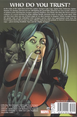 Written by BRIAN MICHAEL BENDIS Penciled by LEINIL YU & CARLO PAGULAYAN Cover by LEINIL YU The New Avengers have found a huge clue to the threat that has faced them since the day they banded together; now just the knowledge of that threat is tearing them apart. What secret could be so damning that it could do to the New Avengers what the Civil War could not? This volume ties into or wraps up threads from CIVIL WAR, WORLD WAR HULK, both AVENGERS titles and the upcoming SECRET INVASION! Collecting NEW AVENGERS #32-37 and ANNUAL #2. 184 PGS./Rated A ?$24.99