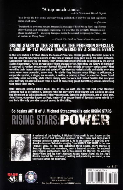 TOP COW is proud to bring you issues 9-15 of the critically acclaimed series RISING STARS. This second story arc written by J.MICHAEL STRACZYNSKI (BABYLON 5, CRUSADE) continues the tale of the Specials as they wage war between themselves and the rest of the world. With an all new cover by current series artist Brent Anderson (ASTRO CITY), this great collection is the perfect way to revisit your favorite Rising Stars moments or finally piece together those missing issues.