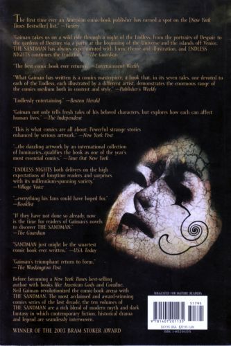 Joined by a dream-team of artists from around the world, Neil Gaiman - the Hugo Award-winning, New York Times best-selling author of American Gods and the children's book Coraline - returned to the beloved characters he made famous for THE SANDMAN: ENDLESS NIGHTS, the comics event of 2003. Now this landmark work is available in a beautiful softcover edition. Alternately haunting, bittersweet, erotic and nightmarish, the seven stories in this book - one for each of the Endless siblings, each illustrated by a different artist - reveal strange secrets and surprising truths. In addition to the seven tales of the Endless, THE SANDMAN: ENDLESS NIGHTS includes a biography section in the spirit of the Sandman collections (designed by Dave McKean) and a summary of each volume in the Sandman Library.