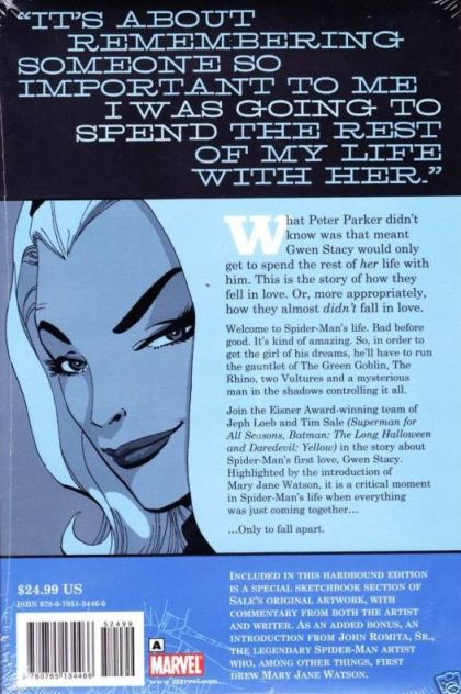 'It's about remembering someone so important to me I was going to spend the rest of my life with her.' What Peter Parker didn't know was that meant Gwen Stacy would only get to spend the rest of her life with him. This is the story of how they fell in love. Or more appropriately, how they almost didn't fall in love. Welcome to Spider-Man's life. Bad before good. It's kind of amazing. So to get the girl of his dreams, he'll have to run the gauntlet of the Green Goblin, the Rhino, two Vultures and a mysterious man in the shadows controlling it all. Join the Eisner Award-winning team of Jeph Loeb and Tim Sale (Superman for All Seasons, Batman: The Long Halloween, DAREDEVIL: YELLOW, HULK: GRAY) in the story about Peter Parker's first love, Gwen Stacy. Highlighted by the introduction of Mary Jane Watson, it is a critical moment in Spider-Man's life when everything was just coming together - only to fall apart. Collecting SPIDER-MAN: BLUE #1-6.