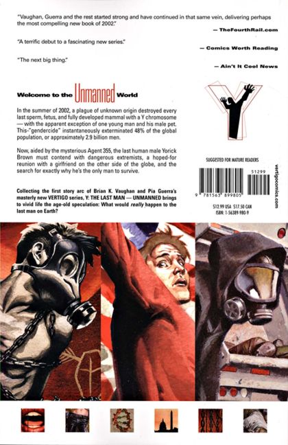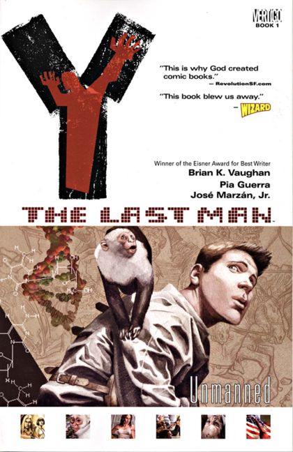 "Y" is none other than unemployed escape artist Yorick Brown (his father was a Shakespeare buff), and he's seemingly the only male human left alive after a mysterious plague kills all Y-chromosome carriers on earth. But why are he and his faithful companion, the often testy male monkey Ampersand, still alive? He sets out to find the answer (and his girlfriend), while running from angry female Republicans (now running the government), Amazon wannabes that include his own sister (seemingly brainwashed), and other threats. The Vertigo team of Brian K. Vaughan, Pia Guerra, and José Marzán Jr. have given us a great read! Collects Y: The Last Man issues #01-#05