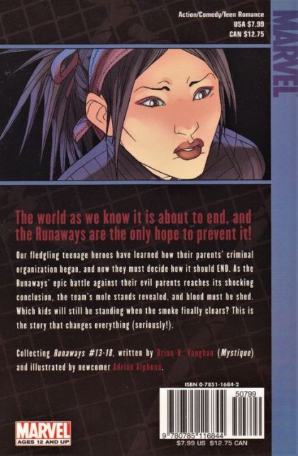 Written by BRIAN K. VAUGHAN Penciled by ADRIAN ALPHONA Cover by JO CHEN The world as we know it is about to end, and the Runaways are the only hope to prevent it! Our fledgling teenage heroes have learned how their parents' criminal organization began, and now they must decide how it should END. As the Runaways' epic battle against their evil parents reaches its shocking conclusion, the team's mole stands revealed, and blood must be shed. Which kids will still be standing when the smoke finally clears? This is the story that changes everything (seriously!). Collecting RUNAWAYS #13-18. 144 PGS./Rated T+