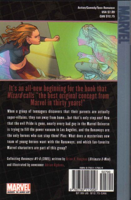 Written by BRIAN K. VAUGHAN Penciled by ADRIAN ALPHONA Cover by JO CHEN When a group of teenagers discovers that their parents are actually super-villains, they run away from home...but that's only step one! Now that the evil Pride is gone, nearly every bad guy in the Marvel Universe is trying to fill the power vacuum in Los Angeles, and the Runaways are the only heroes who can stop them! Plus: What does a mysterious new team of young heroes want with the Runaways, and which fan-favorite Marvel characters are part of this group? Collecting RUNAWAYS (2005) #1-6. 144 PGS./Rated T+