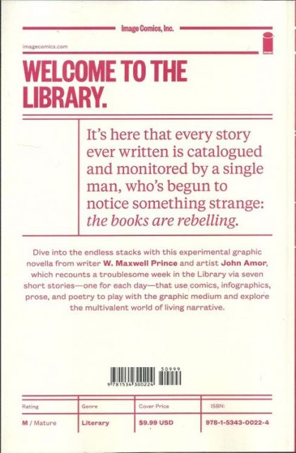 Welcome to the Library. It's here that every story ever written is catalogued and monitored by a single man, who's begun to notice something strange: the books are rebelling. Image Comics proudly presents this experimental graphic novella from writer W. MAXWELL PRINCE and artist JOHN AMOR, which recounts a troublesome week in the Library via seven short stories-one for each day-that use comics, infographics, prose, and poetry to play with the graphic medium and explore the multivalent world of living narrative.