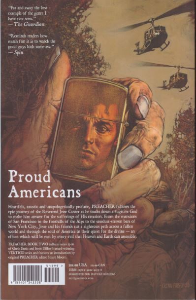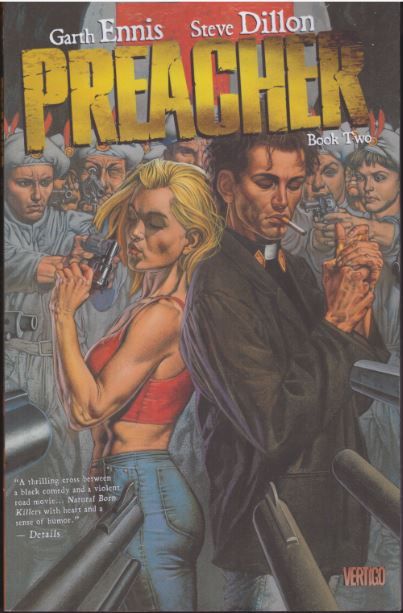 In this new trade paperback collecting PREACHER #13-26, Jesse Custer, his girlfriend Tulip and their vampire friend Cassidy head west to a party of Babylonian proportions. Then Jesse flies to France to rescue Cassidy from the clutches of religious fanatics. His search leads him into battle against the forces of the mysterious organization known as The Grail.