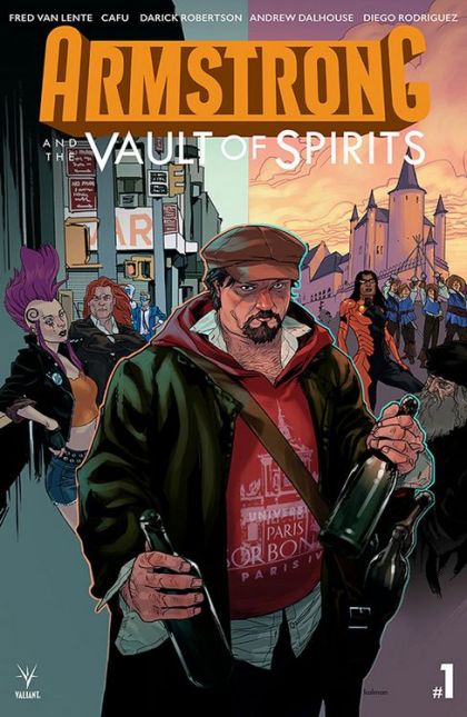 What secrets await inside the Vault of Spirits? Deep beneath New York City’s seediest dive bar, Armstrong – the hard-hitting, harder-partying immortal veteran of history’s greatest escapades – is hosting an invitation-only affair for his most beloved friends and allies! Archer… Ivar, Timewalker… Faith… Quantum and Woody… And special guests from across the Valiant Universe… All have been offered a seat at the table for a personally guided tour of Armstrong’s most valuable and tightly guarded treasure… From the Great Flood to ancient Greece to the height of the Crusades, raise a glass as Armstrong recounts the true stories of his wine-soaked path down through the ages and the artifacts that reside within his own secret archive! ARCHER & ARMSTRONG maestro Fred Van Lente returns with rising star CAFU (RAPTURE) and comics legend Darick Robertson (HARBINGER RENEGADE) to chronicle the first landmark solo adventure in the very (very, very) long life and times of Valiant’s very own disorderly immortal!
