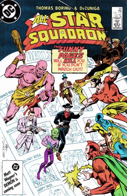 Johnny Quick and Liberty Belle enjoy a breakfast at the All-Star Squadron headquarters, with Johnny reading the funny papers and the two of them discussing their impending wedding, when various villains from the comic strips come to life and start attacking regular citizens. Johnny Quick and Liberty Belle go into action, as do various other All-Star Squadron members, as they take on the comic strip villains, only to see them disappear and a cartoon face called Funnyface appears, taunting them for their efforts before also disappearing. Eventually Firebrand is captured and held in the lab of Funnyface, who is a human wearing a round cartoon face mask, who operates a machine that can turn comic strips into living beings, and vice versa as he tries to turn Firebrand into a comic strip. The All-Star Squadron figure out where Funnyface's lab is located and manage to overpower him while Sandy the Golden Boy throws the switch to restore Firebrand to normal while reverting all the comic strip villains back to their original forms. Funnyface is unmasked and reveals himself to be a cartoonist whose ideas were rejected by publishers and has built the machine to prove himself as a public menace. After he destroys the machine, the All-Star Squadron take Funnyface into custody, feeling glad that the only place they'll see such villains are in the funny papers.
