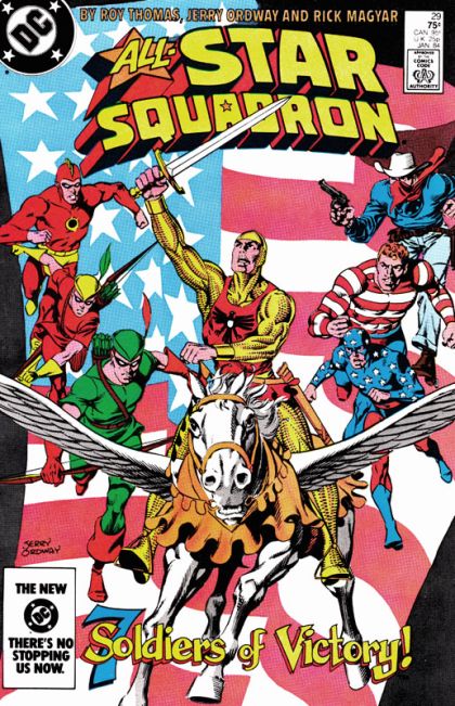 9 January 1942: At the end of a translantic flight aboard Winston Churchill's Boeing 314 flying boat “Berwick”, arriving over Britain, Prime Minister Churchill and Sir Justin encounter a night-time German bombing raid on London. Leaving the craft aboard Winged Victory, the Shining Knight attacks and damages an air-raiding German bomber, then alights on a rooftop. Shortly later he has a long conversation with Winston Churchill, in which he relates the events of a previous adventure with the Seven Soldiers of Victory. At his secret laboratory in a lighthouse tower, on Long Island, Dr. Wilfred Doome invented a time machine, and used it to abduct, each from the hour of his greatest triumph, five historic conquerors: Nero, Attila, Bonaparte, Genghis Khan, and Alexander the Great. Each materialized in Doome's laboratory, and each was able to speak and understand English. Doome gave each of them a wand, with which to communicate amongst themselves, and each with the potential to send its user back to the very instant from which Doome's time beam had seized him. Doome showed them some movies and made them some promises, and recruited these despots to his world-conquering cause. And the first step would be to steal five of the rarest metals on Earth. In New York, on Wall Street, Speedy witnessed an armored-car robbery, intervened, and got knocked unconscious, with Attila impulsively stealing Speedy's brand-new walky-talky radio. The bad guys escaped in a seaplane piloted by Dr. Doome, with the radio transmitting the whole time. Green Arrow and Speedy eavesdropped momentarily, but the signal faded. They called in the Seven Soldiers, and met up with them in a nondescript building in New York, during which confab the radio sparked back to life, and clues were gleaned, then the team split up. The Star Spangled Kid and Stripesy, in the Star-Rocket Racer, went after a stolen gold shipment, near the Canadian border, and brought down Napoleon's airplane. Bonaparte momentarily escaped, on foot, into the trackless forests, but was caught by some mental hospital orderlies, and almost packed into a padded truck, before he activated his Time Rod, and escaped back to the early 19th century. In the Everglades, Alexander the Great used a catapult to kill a brilliant inventor named Leo Starr, then searched for Starr's supply of radium, finding it already installed into some “humanized robots,” as a power source. Alexander intuited that now he'd be able to simply march the robots to rejoin Doome. Green Arrow and Speedy showed up in the Arrowcar, knocked down his robots, and defeated him with arrows; Alexander activated his Time Rod, and escaped back to the 4th century BC. Sir Justin and Winged Victory went after a platinum shipment, at the little port town of Jackpot, Alaska. They invaded Genghis Khan's cavern hideout, defeated his tommy-gun-wielding hoodlums, gof ineffectually head-konked by a 13th-century Mongol minion, and caught Genghis Khan, who then activated the Time Rod that Doome had given him, and escaped back to the 13th century. The Vigilante, and his Times Square cowboy pal Billy Gunn, went after a load of tantalum, at Mount Rushmore in the Black Hills of South Dakota, and there he defeated Attila the Hun, and a few sword-wielding hench-Huns. Vig and Billy brought guns to this swordfight, and they won it, but Attila activated his Time Rod and escaped back to the 5th century. The Crimson Avenger and Wing slipped aboard Nero Claudius Caesar's galley, at sea near a lighthouse on Long Island, and fought with Nero's Roman soldiers, and at first they were winning, but numbers got the better of them, and the heroes were set to work on the oars. A young stowaway (Sammy Singer) freed them, and this time they got a grip on Nero, but he activated his Time Rod and escaped back to the 1st century. But the Crimson Avenger had learned that the lighthouse was the base of the main villain. The Seven Soldiers converged on Doome's hide-out; he dropped a bundle of dynamite on them; Vigilante shot off the fuse. The team walked into a hallway with spiky walls which closed in on them, but the Shining Knight shaved the spikes right off the walls with his irresistible broadsword. Finally Doome seemed cornered; he couldn't flee into the future because he still lacked the metals he needed, but he had one last Time Rod in his hand, and escaped, to an unnamed time. But he dropped his Time Rod, and Speedy recovered it, and after a swift war council, the team made use of the device, arriving at the time and place of the Trojan War. Doome was there, and had already cut deals with Agamemnon and Odysseus. A melee erupted, in which the Law's Legionnaires defeated a large number of Greek soldiers, until Sir Justin got within conversing range of Odysseus, and persuaded him of Doome's perfidy and his own team's virtue. When Agamemnon turned against him, Doome activated his Time Rod and escaped back to 1942, but as Doome had forgotten, Speedy also had a Time Rod. In one of his scientific instruments, Doome spotted the team pursuing him through time, homing in on his own chronal vibrations. He made one last pitch, to try to turn the Shining Knight against the other six, but this failed, and the Seven Soldiers materialized in Doome's lab. Doome desperately tried to flee into the future, but his time machine exploded, with him in it. After finishing his tale, Shining Knight reveals he has decided to remain in Britain.