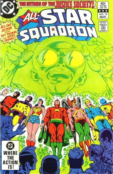 The All-Star Squadron, responding to Brain Wave's challenge, fight their way into the Perisphere on the grounds of the 1939-40 New York World's Fair and find the Justice Society comatose, dreaming of making bloodthirsty war on the Japanese, and being "killed" by the enemy...which may well kill them in the real world.