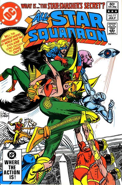 January 7, 1942, on the White House lawn: Akhet the Star-Smasher confronts the Shining Knight (riding Winged Victory), Hawkgirl, Firebrand, Robotman, Johnny Quick, Commander Steel, and the Atom, backed by a platoon of soldiers, and he announces the annexation of Earth into the Binary Brotherhood. A tense few moments pass, in which Liberty Belle cautions Johnny and the Atom, and then Steel and Hawkgirl also, against attacking the pompous spaceman. Akhet gives all of the governments on Earth, on both sides of the war, one day, in which to choose capitulation or annihilation. That's enough for four of the All-Stars (Hawkgirl, Quick, Steel, & Robotman), who charge in to the attack, while the Atom hangs back and waits for an actual order. Akhet waves his hand and all four of the first charge fall down, prompting the other four to rush in. Akhet grabs Hawkgirl and Steel, and steps into a dazzling lightbeam, which levitates him into the air towards his ship, but the Atom and Liberty Belle grab onto him, and their added weight starts to counteract the antigravity effect, until Akhet slaps loose Al and Libby with a sweep of his arm, then uses the tractor beam to complete the abduction of Hawkgirl and Steel, plus Robotman and the Atom. Firebrand's powers don't affect Akhet, and Winged Victory encounters the same mid-air concussion effect that had earlier knocked down Johnny Quick. Infantry rifle-fire and attacking P-40s also prove ineffectual against the weird airship's advanced weapons, as the Star-Smasher clarifies his earlier ultimatum, then boards his incredibly fast ship, and silently departs. For the rest of that day and part of the next, the Flying Eye circumnavigates the world, pausing here and there to let military and civilian people all over Europe and Asia get a good look at it. Soon in Hitler's own bunker Wolfsschanze in East Prussia, the Fuehrer is railing at his generals (about the broken-down invasion of Russia), when they all stroll outside and see the Flying Eye appear overhead. This encounter results in some German soldiers getting knocked over by an advanced energy weapon, and the Flying Eye departs again. In short order, this sort of scene is played out again and again, and the seemingly-invincible spaceman issues ultimatum after ultimatum, to Stalin, Chiang Kai-Shek, Mussolini, and to Tojo, each in his own language. According to Gen. George C Marshall, (as presented to Pres. Franklin D Roosevelt, Prime Minister Winston Churchill, Sir Justin, Firebrand, Liberty Belle, and Johnny Quick, seated around a conference table), 1/ the Axis powers were ready to negotiate some awkward sort of truce for mutual defense against the alien invader Akhet, 2/ there was the question of evacuating Washington and running the country from a secret location. Neither of these questions gets resolved at this meeting, but there is consensus on the point of not surrendering to Akhet, no matter what. Hawkman arrives, greeted by a fusillade of rifle fire from the nervous security patrol, on the grounds outside. It's night and their searchlight's not working, but Firebrand lights up the scene, and the shooting stops. Hawkman's got news. The dying man, ejected from the Flying Eye, that Hawkman had caught in mid-air, earlier, was pioneering Bio-Chemist Garret Owens, who had been missing since 1933. Hawkman has also picked up on some clues from the emblem, on the dead man's collar and on Akhet's flag, and now seems to suspect that this “alien” isn't what he seems. Hawkgirl and the Atom regain consciousness in an empty passageway aboard Akhet's flying eye, untied and unguarded. Atom finds a concealed hatch, and wishes he had a crowbar. Hawkgirl doesn't have a crowbar, but she just happens to have with her a crystal dagger, transparent but stronger than steel. Atom uses this to pry at the hatch until he pops an unseen latch, and they move into another section of unoccupied space. (This in fact is the ancient Egyptian crystal sacrificial dagger from Hawkman's first case).[1] Hawkgirl had been flying back and forth between Washington, D.C. and New York City in December of 1941, moving clothes and personal effects down to Washington. On one recent trip she had swapped out her original hawk-mask for a more feminine looking one, and had also borrowed the crystal dagger from her fiance's weapons collection, staring at it for a long time, then tucking it into a hollow part of one of her wings. Now that she thinks of it, she had done most of this on impulse, and had forgotten that she even had the blade until just now.) Meanwhile in Pennsylvania, the woodland estate of world-reknowned Physio-Mathematician Elwood P Napier is surrounded by All-Stars: Firebrand, Hawkman, Johnny Quick, Liberty Belle, and the Shining Knight on Winged Victory. They're here because Johnny Quick's half-hour-long exhaustive examination of the FBI's file cabinets has confirmed Hawkman's earlier theory. In the 1920s, all of the missing top scientists had been part of a government brain trust, which ran out of funds in 1930. Then from early 1933 until 1940, every six months like clockwork, one of these scientists had disappeared. The most recent disappearance, that of Elwood P Napier, was a year ago, ending the streak. They all sneak into his house and look around, finding many photos of the missing men, and way in the background of one photo, Hawkman spots a familiar face! Just then all of the photos on the wall burst into flame. Atom and Hawkgirl continue exploring the ship until they encounter the imposing form of Akhet himself, or is it? Atom and Hawkgirl charge in and attack the giant, who folds right up and falls down. He's a fake, just a souped-up mannequin, and behind him is a circular room, in which they find, contained in transparent cylinders, unmoving and unaware, Commander Steel, Robotman, and at least 14 distinguished physicists and mathematicians. Then Dr. Hastor walks into the room, much to Hawkgirl's amazement, because the la