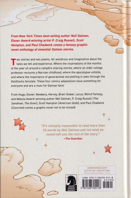 From New York Times best-selling author Neil Gaiman and Eisner-award winning artist P. Craig Russell, Scott Hampton, and Paul Chadwick comes a fantasy graphic novel anthology of essential Gaiman stories. Two stories and two poems. All wondrous and imaginative about the tales we tell and experience. Where the incarnations of the months of the year sit around a campfire sharing stories, where an older college professor recounts a Narnian childhood, where the apocalypse unfolds, and where the importance of generational storytelling is seen through the Goldilocks fairytale. These four comic adaptations have something for everyone and are a must for Gaiman fans!