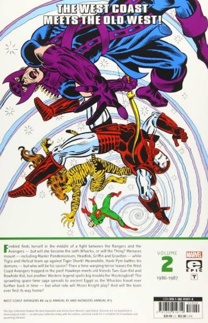 The West Coast meets the Old West! Firebird finds herself in the middle of a fight between the Rangers and the Avengers - but will she become the sixth Whacko, or will the Thing? Menaces mount - including Master Pandemonium, Headlok, Griffin and Graviton - while Tigra and Hellcat team up against Tiger Shark! Meanwhile, Hank Pym battles his demons - but who will be his savior? Then, a time-warping terror leaves the West Coast Avengers trapped in the past! Hawkeye meets old friends Two-Gun Kid and Rawhide Kid, but another Western legend spells big trouble for Mockingbird! The sprawling space-time saga spreads to ancient Egypt as the Whackos travel ever further back in time - but what role will Moon Knight play? And will the team ever find its way home? Collecting WEST COAST AVENGERS (1985) #8-24 and ANNUAL #1, and AVENGERS ANNUAL #15. Rated T