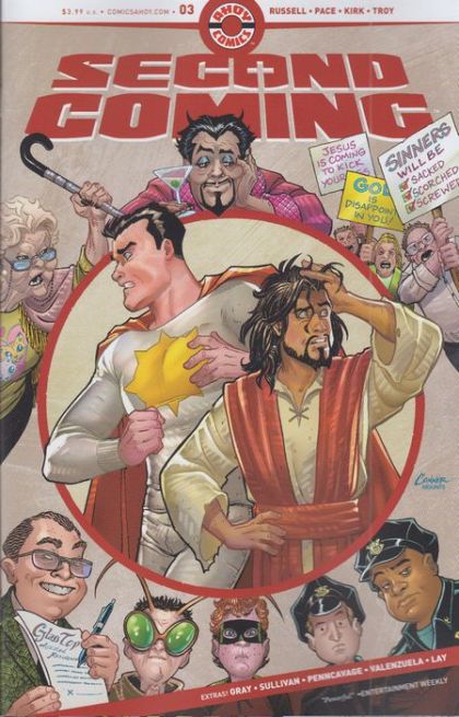 Searching for his missing grandmother, Sunstar is forced to confront the shortcomings of his super-powers. Jesus, left on his own for the day, runs afoul of street preachers. Also: the usual assortment of AHOY prose stories and extra features.