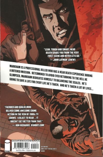 story JAY FAERBER art SIMONE GUGLIELMINI cover FRANCESCO FRANCAVILLA In this second collection of the series BRIAN K. VAUGHAN calls 'a killer crime book with a very sharp hook,' former hitman Markham has relocated to Los Angeles, where he continues his efforts to balance the scales by saving people instead of killing them. But try as he might, Markham can't outrun his dark past. If you like THIEF OF THIEVES and FATALE, you'll love NEAR DEATH. Collects NEAR DEATH #6-11