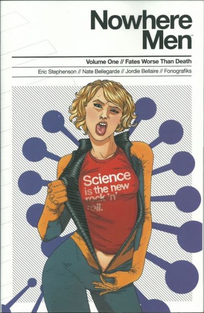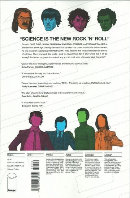 story ERIC STEPHENSON art NATE BELLEGARDE & JORDIE BELLAIRE cover NATE BELLEGARDE & FONOGRAFIKS 'SCIENCE IS THE NEW ROCK 'N' ROLL!' So said Dade Ellis, Simon Grimshaw, Emerson Strange, and Thomas Walker at the dawn of a new age of enlightenment that ushered in a boom in scientific advancement. As the research supergroup World Corp., they became the most celebrated scientists of all time. They changed the world-and we loved them for it. But where did it all go wrong? And when progress is made at any and all cost, who ultimately pays the price? Collects NOWHERE MEN #1-6