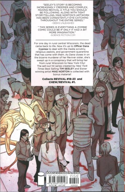 For one day in rural central Wisconsin, the dead came back to life. Now it's up to Officer Dana Cypress to deal with the media scrutiny, religious zealots, and government quarantine that has come with them. Now, as Dana closes in on the bizarre murderer of her Reviver sister, she's swept up in a conspiracy that will bring her from rural Wisconsin to New York City! The sell-out hit series created by New York Times Bestselling writer TIM SEELEY and Eisner-winning artist MIKE NORTON is collected with bonus material! Collects REVIVAL #18-23 & CHEW/REVIVAL #1