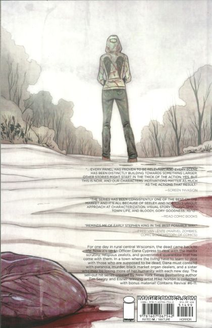story TIM SEELEY art MIKE NORTON & MARK ENGLERT cover MIKE NORTON & JENNY FRISON For one day in rural central Wisconsin, the dead came back to life. Now the living and the recently returned struggle to maintain a sense of normalcy, amidst political and religious conflicts. Collects REVIVAL #6-11.